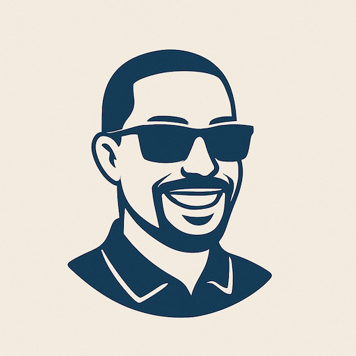 A sleek vector icon representing The R.oB. Opinion, featuring a clean, stylized portrait of Robert Barrimond with sunglasses, mustache, and goatee. The design uses bold navy blue lines on a warm beige background, conveying confidence, intellect, and approachability. Ideal for use as a WordPress favicon or brand avatar.